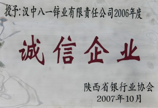 2007年漢中八一鋅業(yè)有限責(zé)任公司2006年度誠(chéng)信企業(yè)