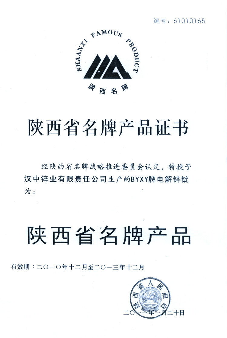 2011年1月,公司生產(chǎn)的BYXY牌電解鋅錠再次榮獲陜西省“名牌產(chǎn)品”稱號(hào) -